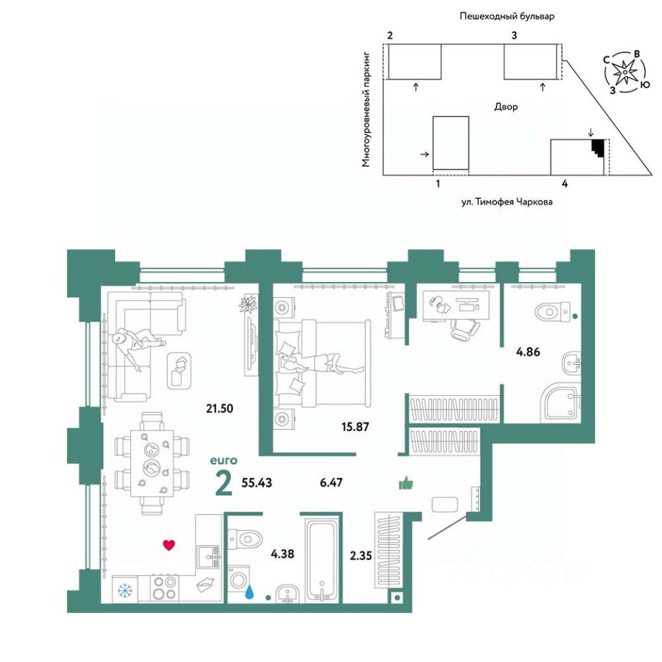 Продается 2комнатная квартира от застройщика "Страна Девелопмент". Стоимость указана без учета акций. Квартира на 17 этаже, площадь квартиры 55,43 кв. м. Сдача — в 3 квартале 2025 года.