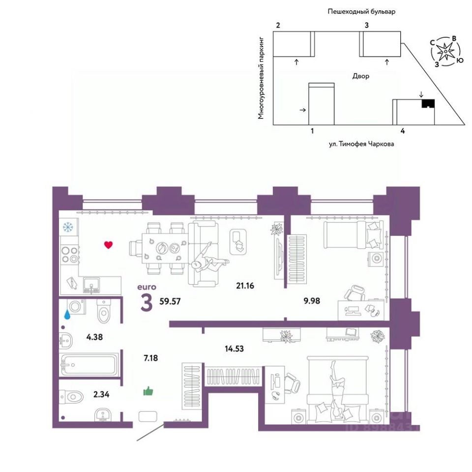 Продается 3комнатная квартира от застройщика "Страна Девелопмент". Стоимость указана без учета акций. Квартира на 27 этаже, площадь квартиры 59,57 кв. м. Сдача — в 3 квартале 2025 года.