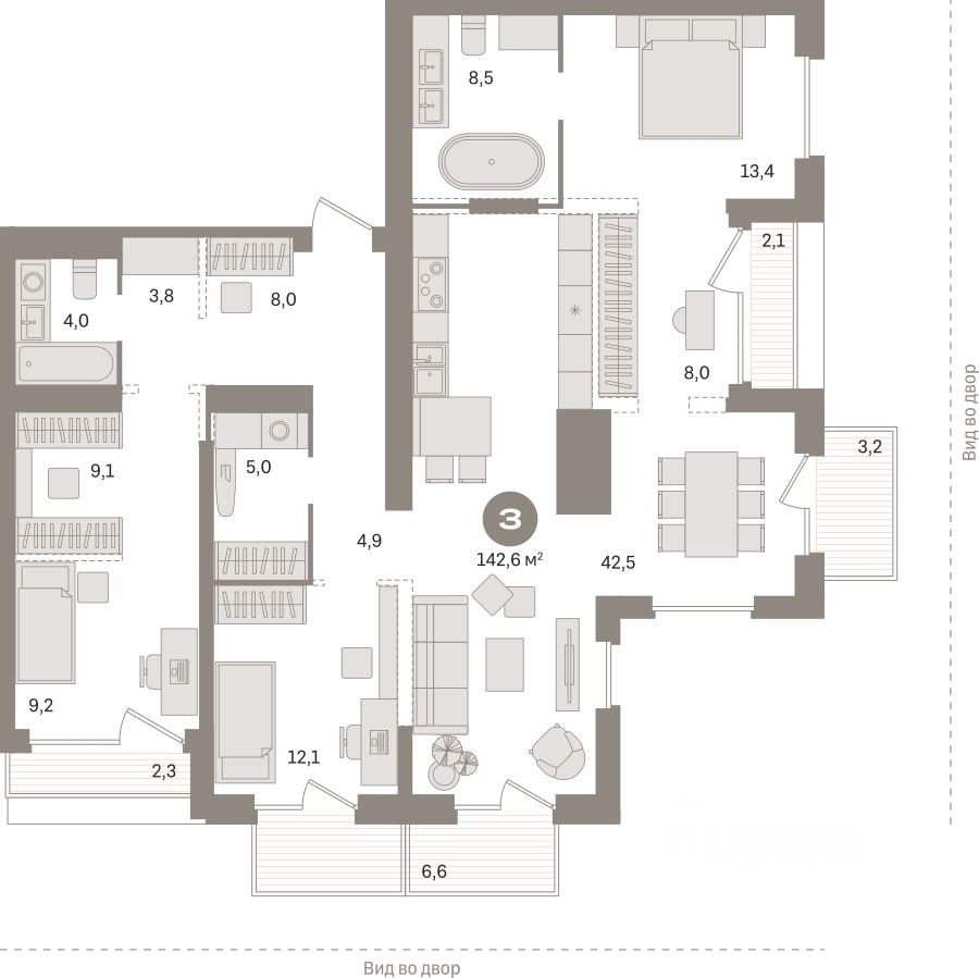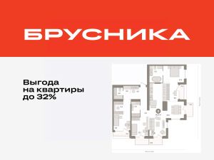 Квартира с кухней-гостиной и тремя спальнями в Октябрьском на Туре. Особенности планировки: гардеробная, без отделки, вид во двор, свободная планировка, мастер-спальня, терраса, постирочная, балкон.