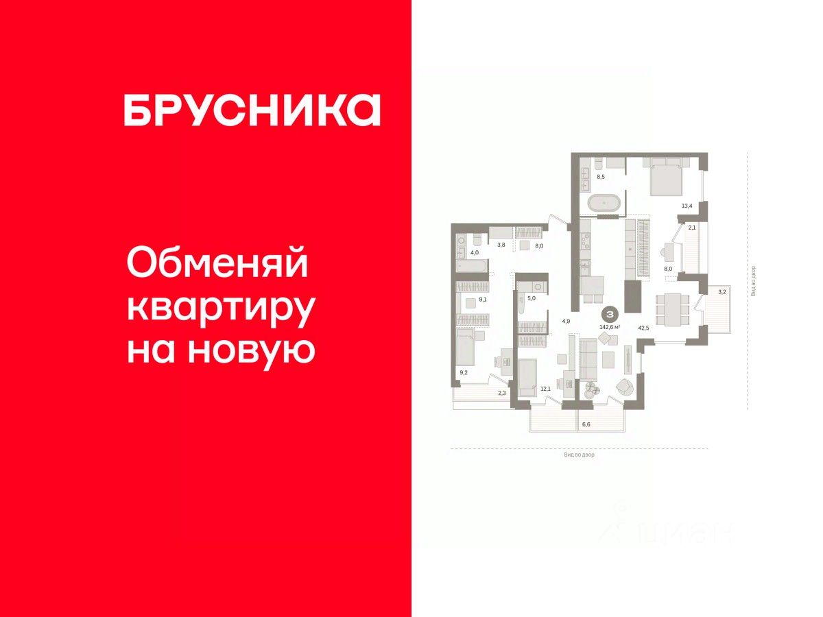 Квартира с кухней-гостиной и тремя спальнями в Октябрьском на Туре. Особенности планировки: балкон, вид во двор, гардеробная, мастер-спальня, постирочная, свободная планировка, терраса.