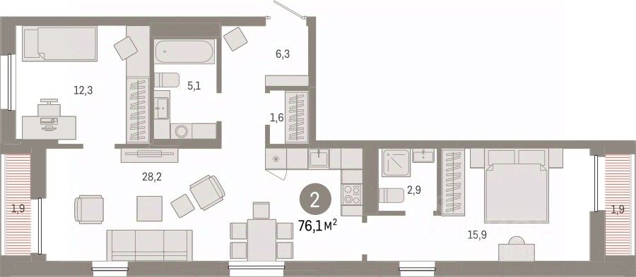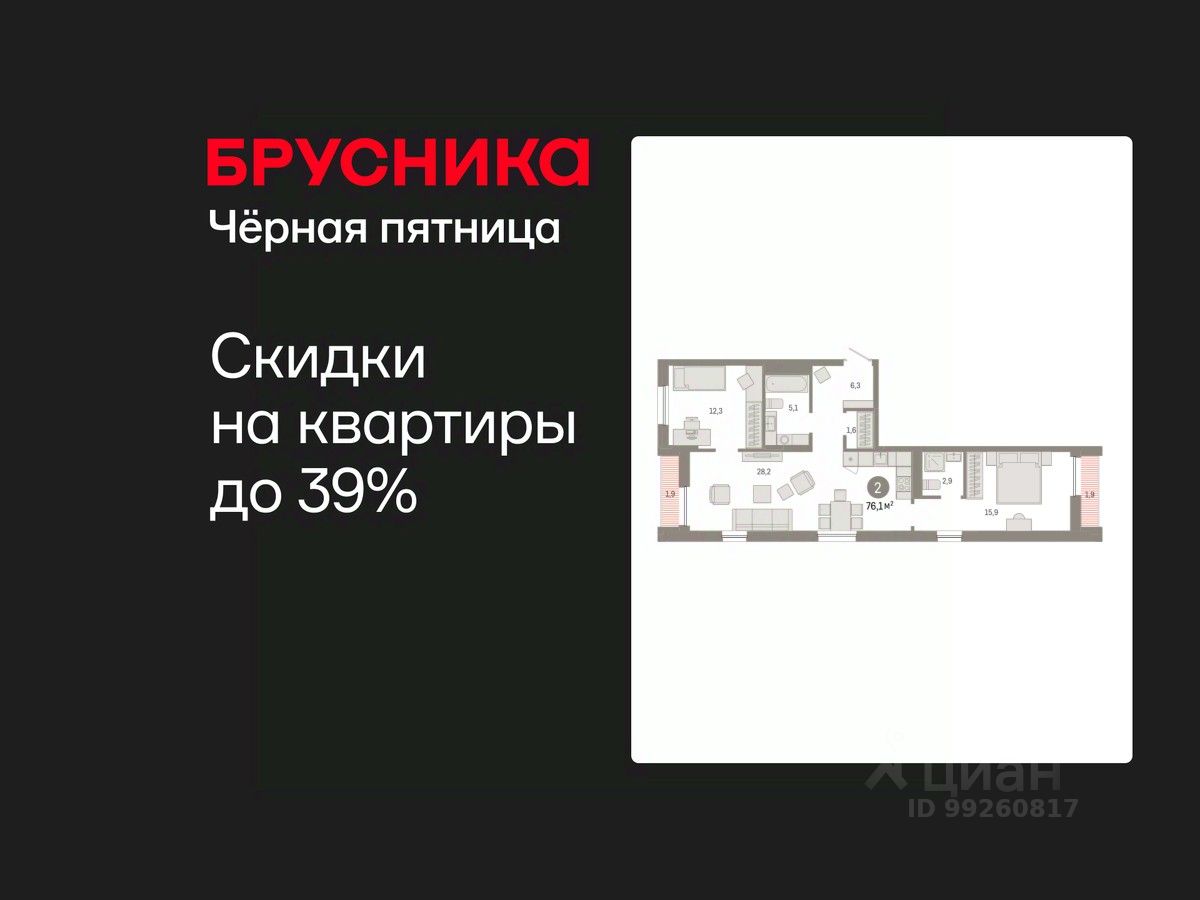 Двухкомнатная квартира с предчистовой отделкой в ЖК "Республики 205" на 16 этаже. Общая площадь: 76.06 кв.м., жилая: 28.2 кв.м., площадь просторной кухни-гостиной: 28.2 кв.м. Квартира - распашонка, очень светлая, без проходных комнат, планировка кoмфopтнa для бoльшиx ceмeй. В квартире один балкон и одна лоджия, два совмещенных санузла. Высота потолков 2.6 м.