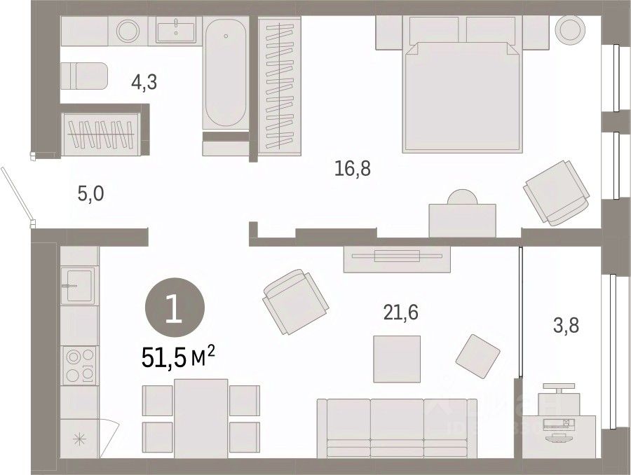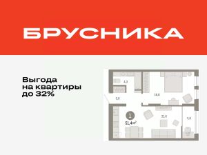 Продается 1-комн. квартира с предчистовой отделкой в ЖК "Республики 205" на 16 этаже. Общая площадь: 51.45 кв.м., жилая: 16.8 кв.м., площадь просторной кухни-гостиной: 21.6 кв.м. Все окна выходят на одну сторону. В квартире одна лоджия, один совмещенный санузел. Высота потолков 2.6 м.
