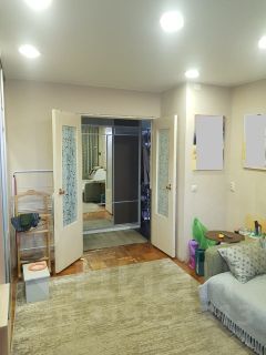 Требуется косметический ремонт квартиры, пол - щитовой паркет, балкон защищен деревянными окнами от осадков - используется как кладовка. Натяжной потолок только в зале, пластиковые окна везде, кроме 1 комнаты - деревянное окно в ванной и туалете - кафель-плитка в хорошем состоянии.