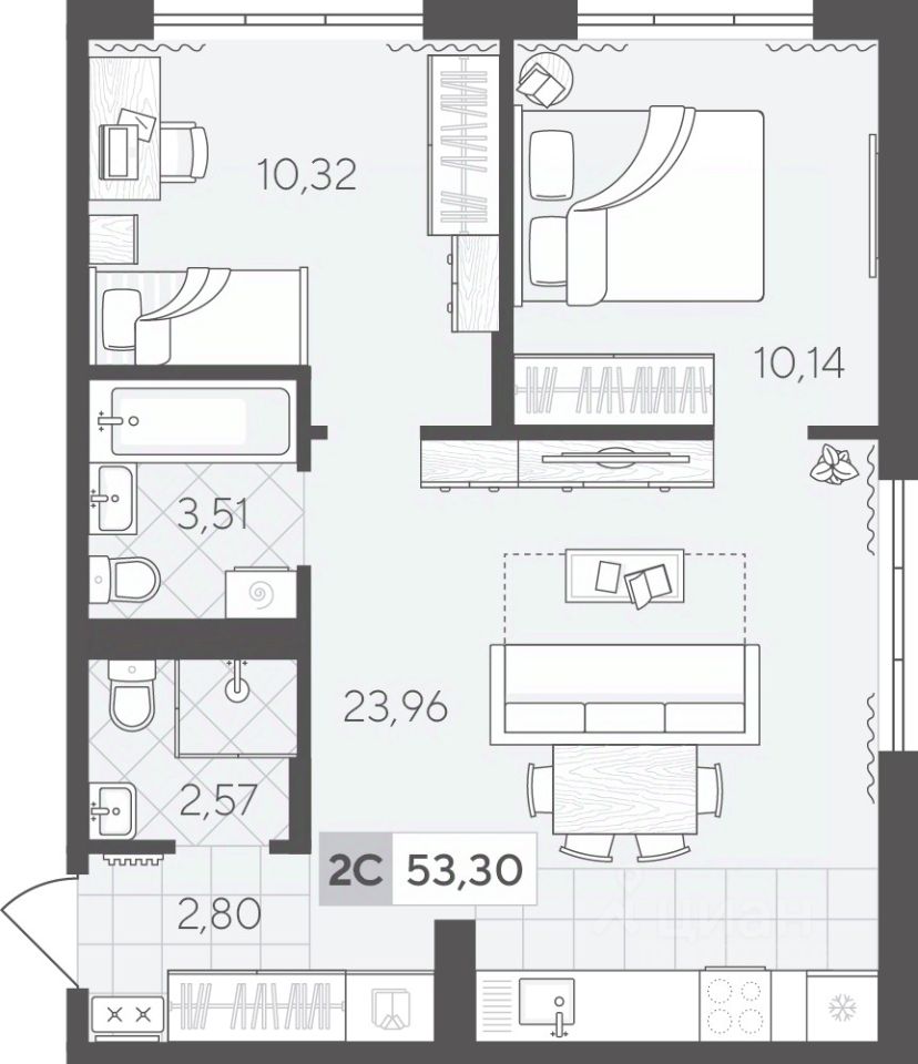 Квартира с двумя спальнями площадью 53.3 кв.м на 2 этаже. Продуманная геометрия комнат позволит легко зонировать пространство для личного досуга и места, где удобно проводить время с семьей или встречать гостей.