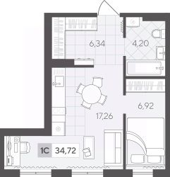 Уютная однокомнатная квартира 34.72 кв.м на 2 этаже. Функциональная планировка позволяет удобно организовать быт, а кухня-гостиная подойдёт для отдыха и общения.