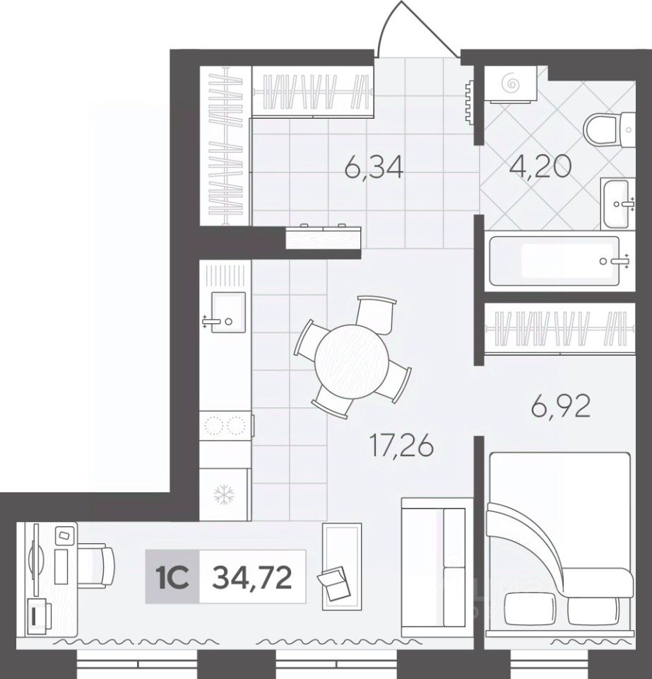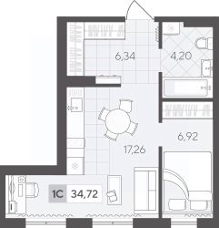 Однокомнатная квартира 34.72 кв.м на 2 этаже с просторной кухней-гостиной. Здесь легко создать уютное пространство для встреч, а отдельная спальня обеспечивает комфорт и личное пространство..