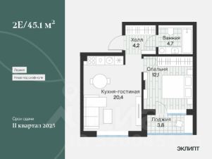 Планировка с лоджией. Выход на неё через спальню. Гостиная объеденена с кухней, при этом у каждого пространства своё место.
