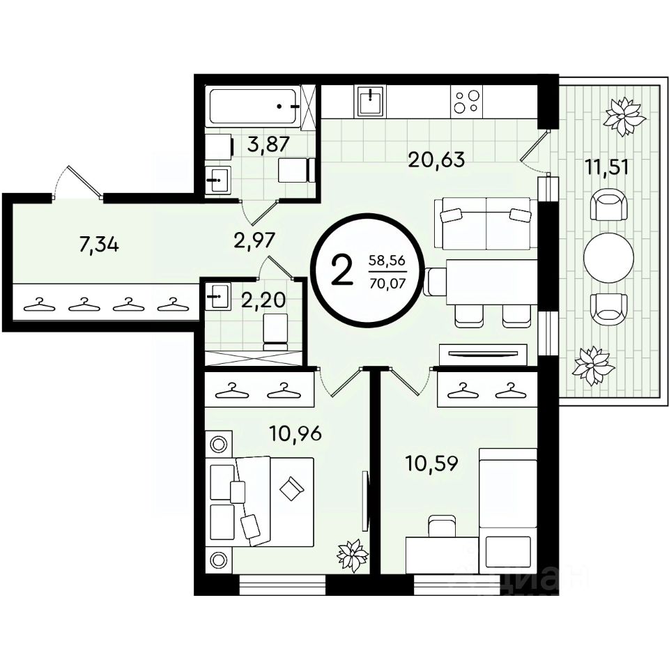 Общая площадь70,07 м²