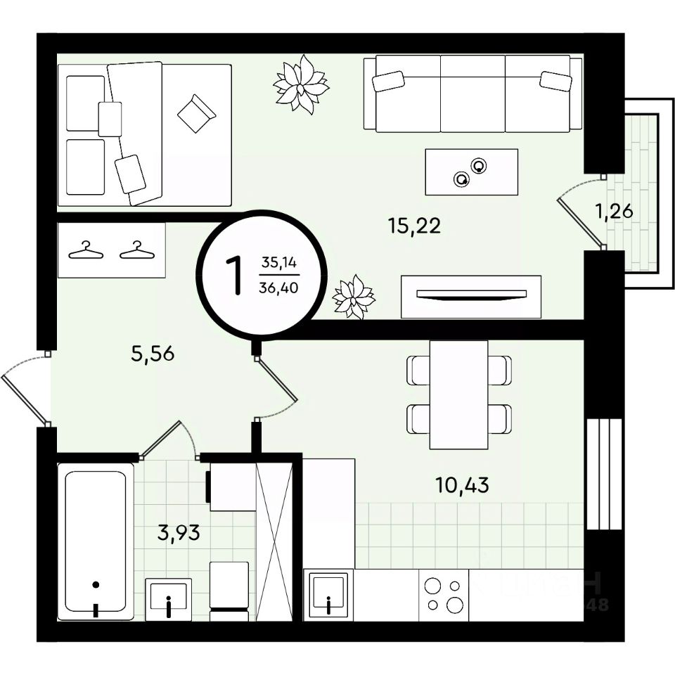 Общая площадь36,4 м²