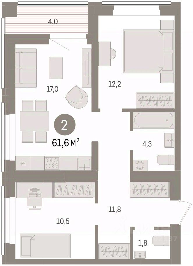 Квартира с кухней-гостиной и двумя спальнями в жилом районе "Речной порт". Особенности планировки: второй санузел, лоджия, разнесённые спальни, предчистовая отделка.