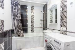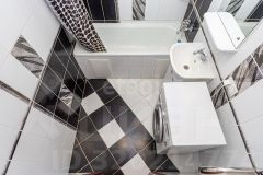 Состояние под ключ: стены выровнены штукатуркой под обои, полы с линолеумом, санузел полностью облицован кафелем с современной сантехникой