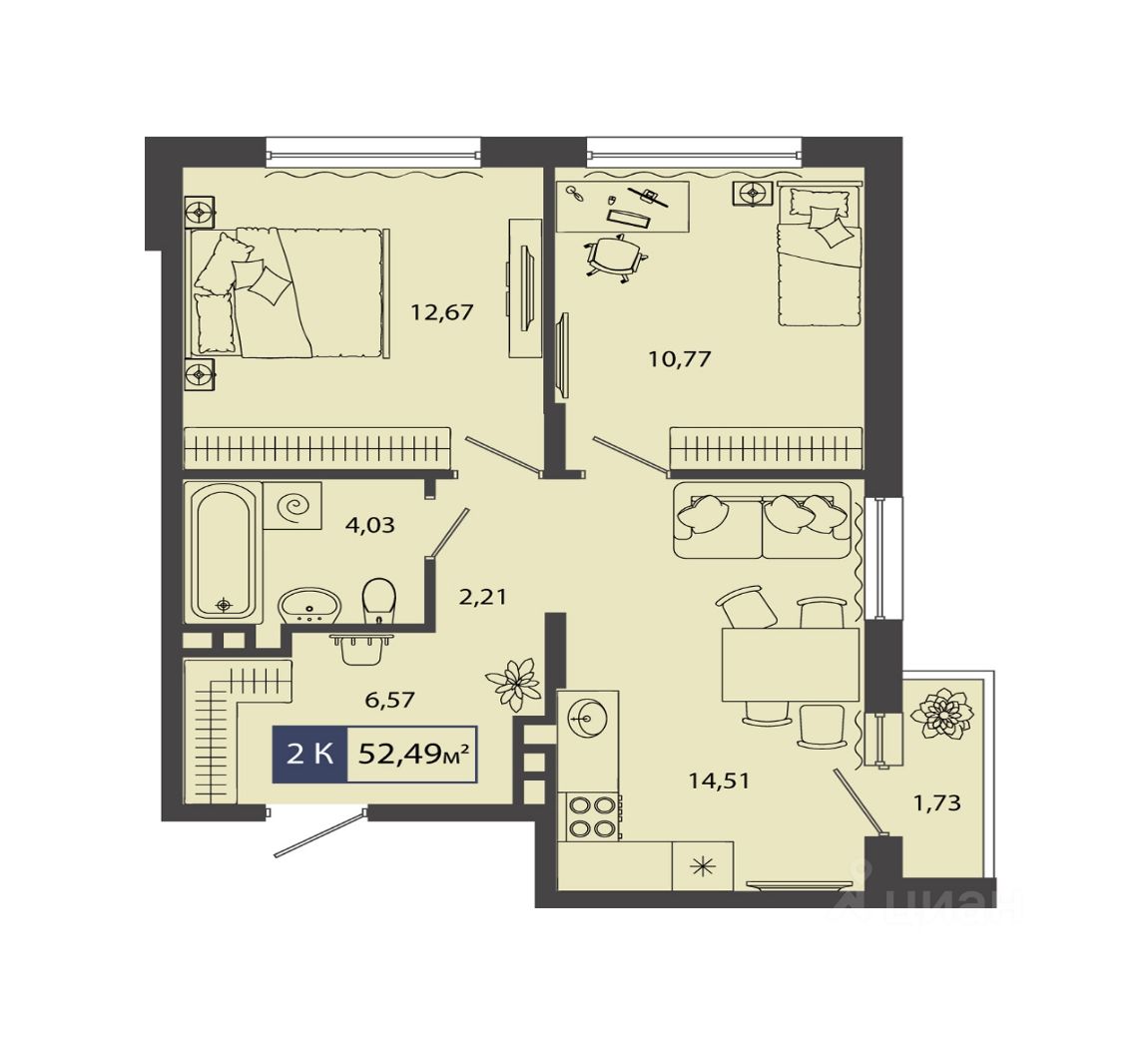 Продаётся квартира площадью 52.49 м2 в жилом комплексе "Смородина".
