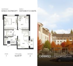 Продаётся квартира площадью 52.49 м2 в жилом комплексе "Смородина". Квартира находится на 1 этаже, жилая площадь квартиры 23.44 м2, площадь просторной кухни — 14.51 м2. Среди особенностей планировки — изолированные комнаты с окнами на одну сторону, 1 совмещённый санузел.