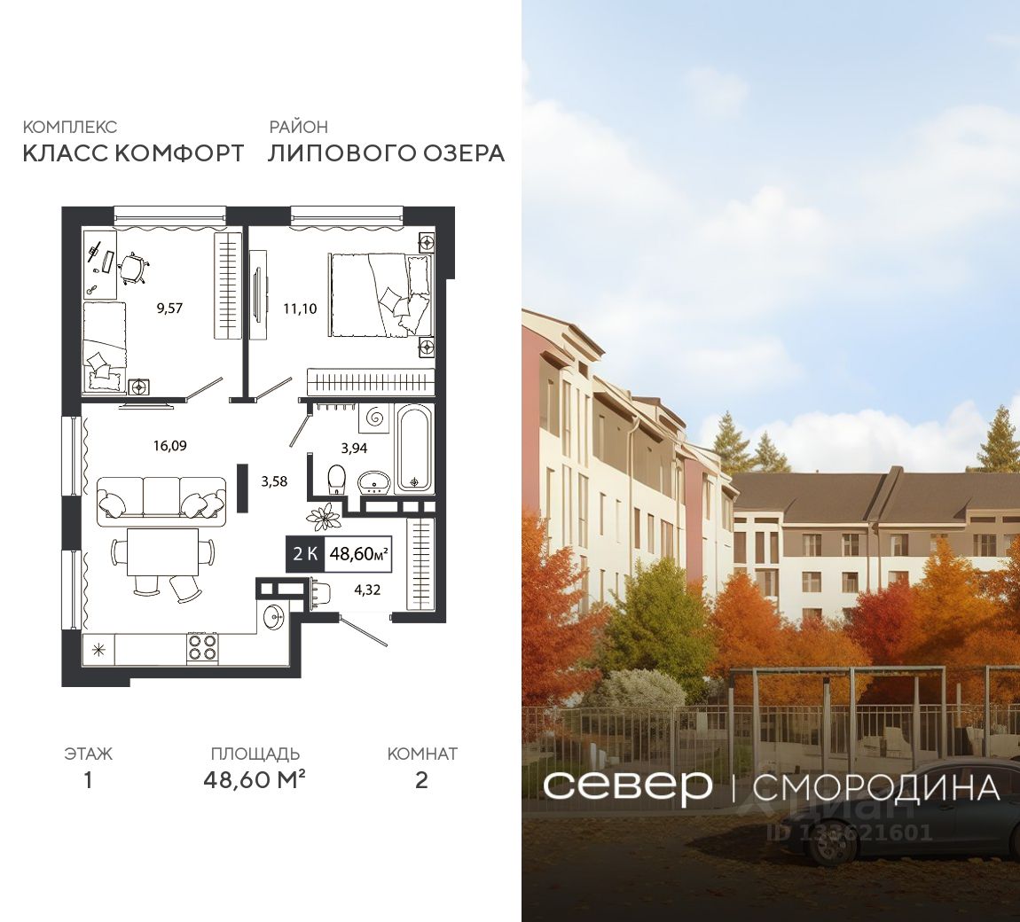 Продаётся квартира площадью 48.60 м2 в жилом комплексе "Смородина". Квартира находится на 1 этаже, жилая площадь квартиры 20.67 м2, площадь просторной кухни — 16.09 м2. Среди особенностей планировки — изолированные комнаты с окнами на одну сторону, 1 совмещённый санузел.