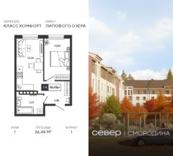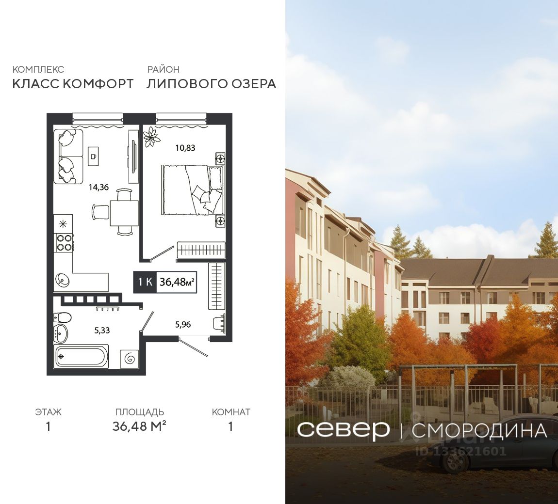 Продаётся квартира площадью 36.48 м2 в жилом комплексе "Смородина". Квартира находится на 1 этаже, жилая площадь квартиры 10.83 м2, площадь просторной кухни — 14.36 м2. Среди особенностей планировки — изолированные комнаты с окнами на одну сторону, 1 совмещённый санузел.