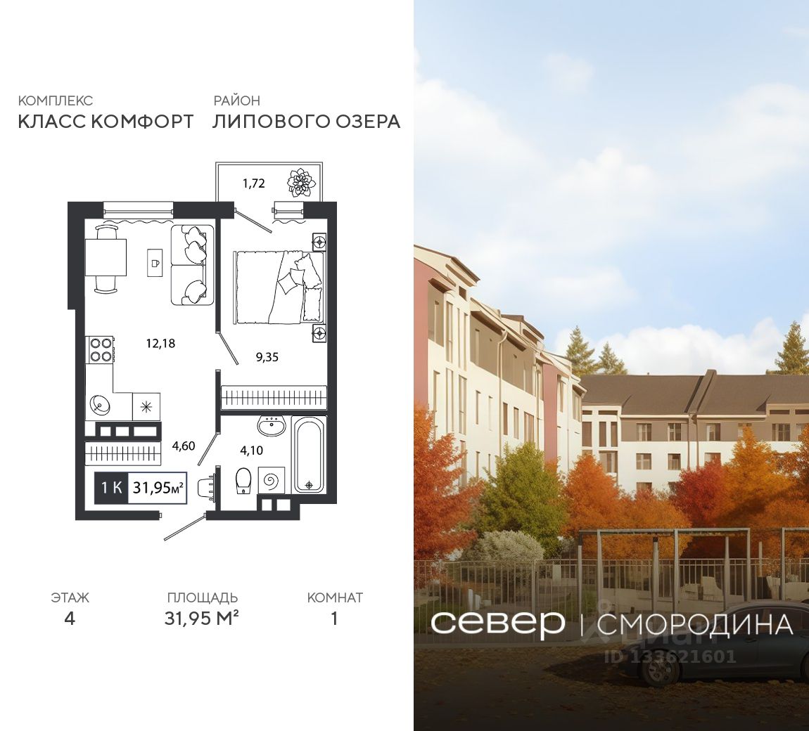 Продаётся квартира площадью 31.95 м2 в жилом комплексе "Смородина". Квартира находится на 4 этаже, жилая площадь квартиры 9.35 м2, площадь просторной кухни — 12.18 м2. Среди особенностей планировки — изолированные комнаты с окнами на одну сторону, 1 совмещённый санузел.