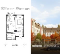 Продаётся квартира площадью 38.20 м2 в жилом комплексе "Смородина". Квартира находится на 4 этаже, жилая площадь квартиры 10.83 м2, площадь просторной кухни — 14.36 м2. Среди особенностей планировки — изолированные комнаты с окнами на одну сторону, 1 совмещённый санузел.