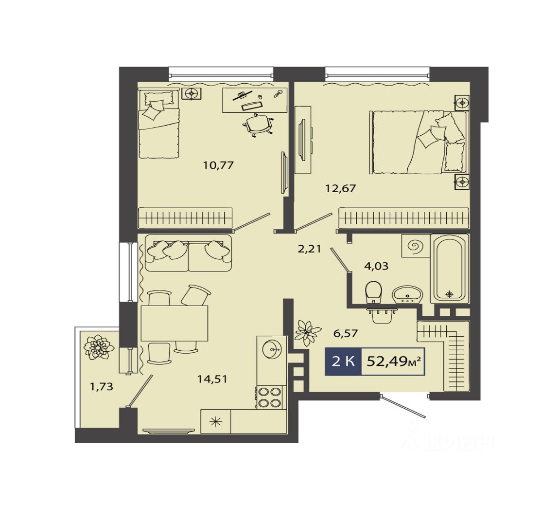Продаётся квартира площадью 52.49 м2 в жилом комплексе "Смородина".