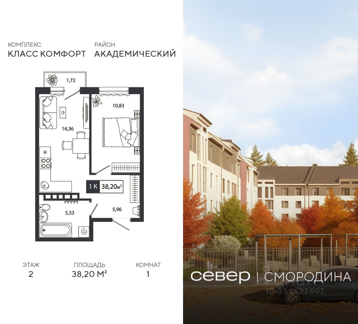Квартира находится на 2 этаже дома, который будет введен в эксплуатацию в second квартале 2028 года. Жилая площадь квартиры 10.83 м2, площадь просторной кухни — 14.36 м2. Среди особенностей планировки — изолированные комнаты с окнами на одну сторону, 1 совмещённый санузел.