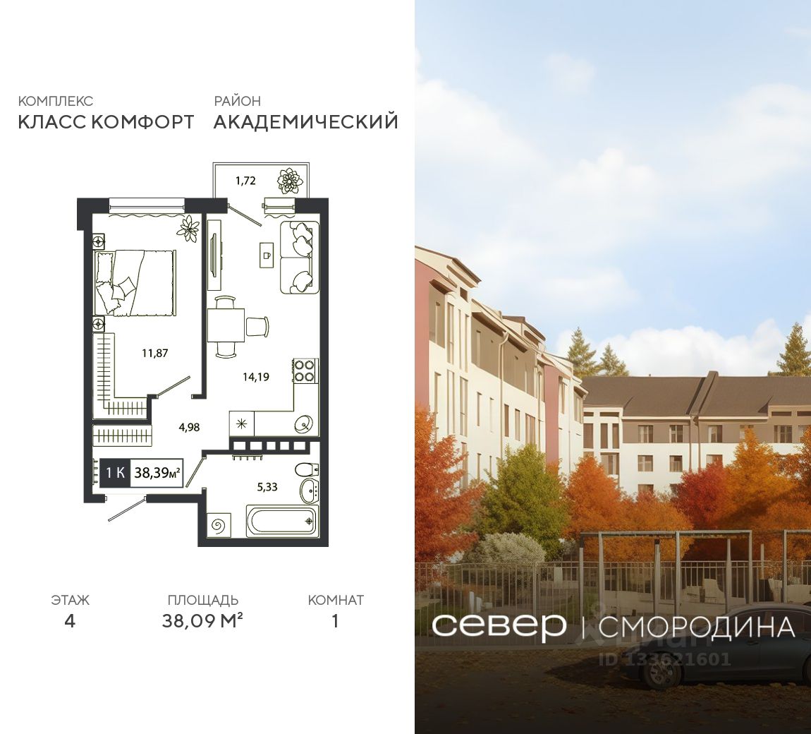 Продаётся квартира площадью 38.09 м2 в жилом комплексе "Смородина".