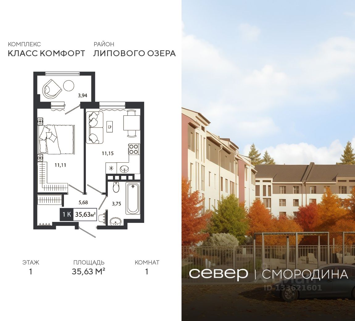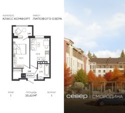 Продаётся квартира площадью 35.63 м2 в жилом комплексе "Смородина". Квартира находится на 1 этаже, жилая площадь квартиры 11.11 м2, площадь просторной кухни — 11.15 м2. Среди особенностей планировки — изолированные комнаты с окнами на одну сторону, 1 совмещённый санузел.