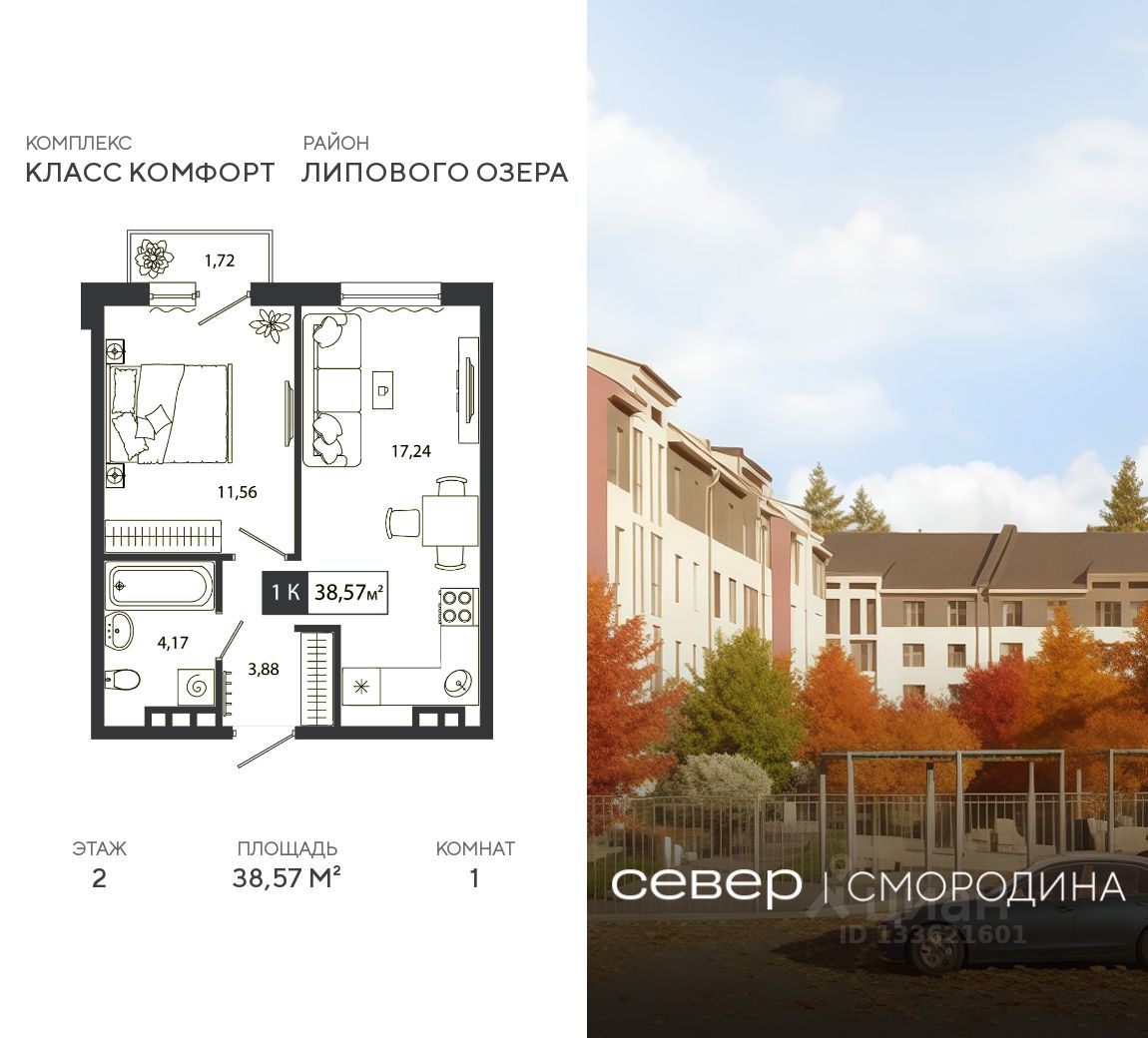 Продаётся квартира площадью 38.57 м2 в жилом комплексе "Смородина". Квартира находится на 2 этаже, жилая площадь квартиры 11.56 м2, площадь просторной кухни — 17.24 м2. Среди особенностей планировки — изолированные комнаты с окнами на одну сторону, 1 совмещённый санузел.