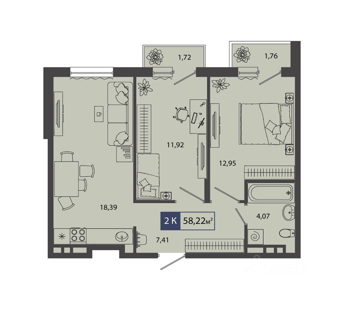 Продаётся квартира площадью 58.22 м2 в жилом комплексе "Смородина".