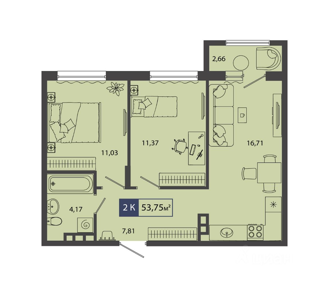 Продаётся квартира площадью 53.75 м2 в жилом комплексе "Смородина".