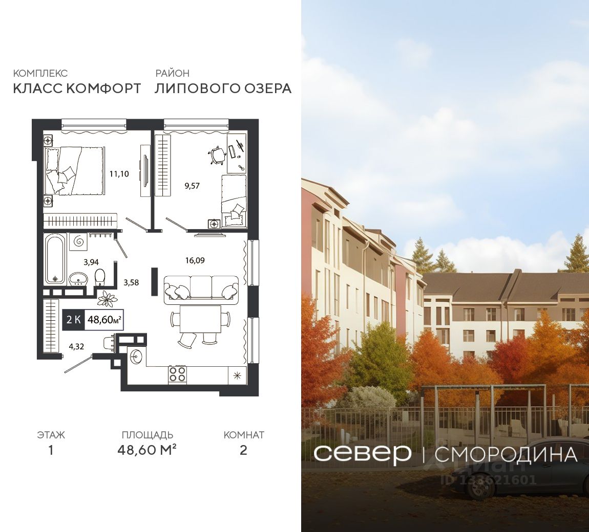 Продаётся квартира площадью 48.60 м2 в жилом комплексе "Смородина". Квартира находится на 1 этаже, жилая площадь квартиры 20.67 м2, площадь просторной кухни — 16.09 м2. Среди особенностей планировки — изолированные комнаты с окнами на одну сторону, 1 совмещённый санузел.