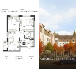 Продаётся квартира площадью 52.49 м2 в жилом комплексе "Смородина". Квартира находится на 1 этаже, жилая площадь квартиры 23.44 м2, площадь просторной кухни — 14.51 м2. Среди особенностей планировки — изолированные комнаты с окнами на одну сторону, 1 совмещённый санузел.