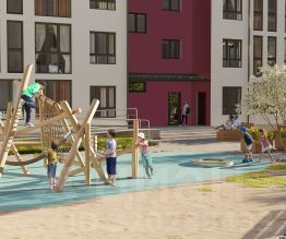 Прямо во дворе — собственные грядки для жителей, где можно выращивать зелень и цветы. Для детей оборудованы детские площадки из натуральных материалов.