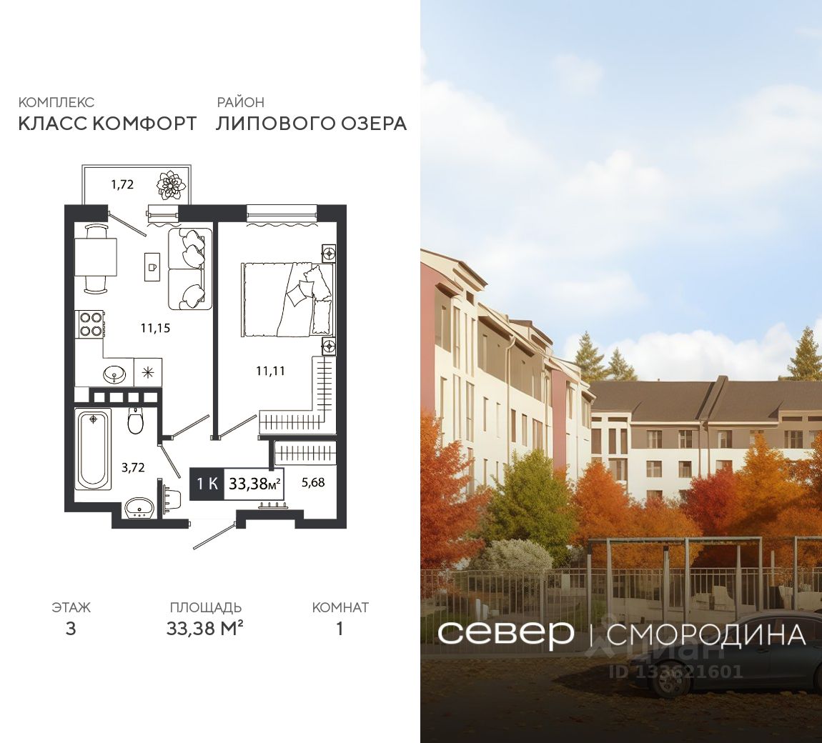 Продаётся квартира площадью 33.38 м2 в жилом комплексе "Смородина". Квартира находится на 3 этаже, жилая площадь квартиры 11.11 м2, площадь просторной кухни — 11.15 м2. Среди особенностей планировки — изолированные комнаты с окнами на одну сторону, 1 совмещённый санузел.
