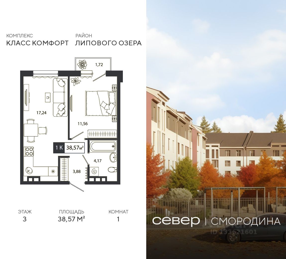 Продаётся квартира площадью 38.57 м2 в жилом комплексе "Смородина". Квартира находится на 3 этаже, жилая площадь квартиры 11.56 м2, площадь просторной кухни — 17.24 м2. Среди особенностей планировки — изолированные комнаты с окнами на одну сторону, 1 совмещённый санузел.