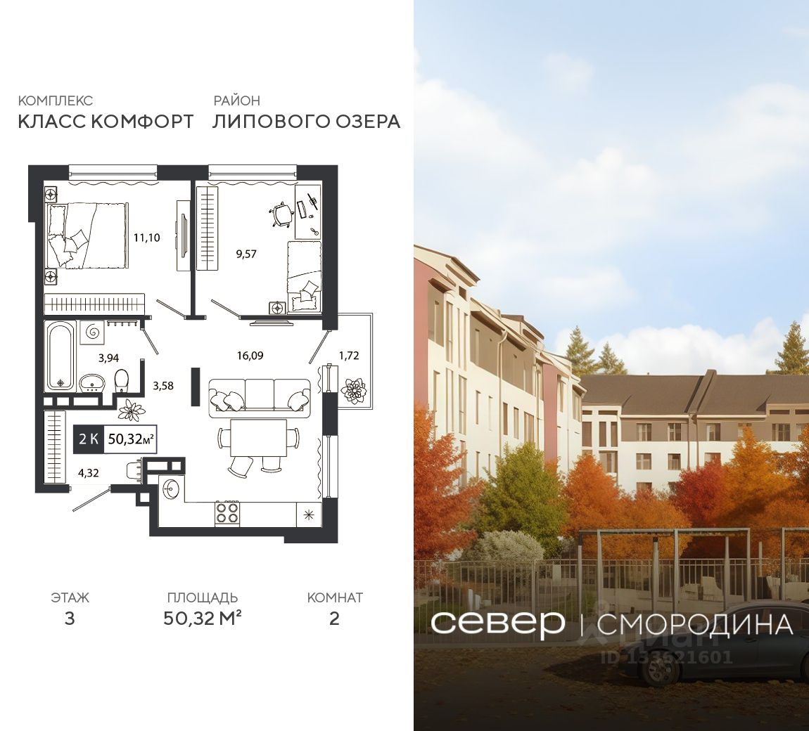 Продаётся квартира площадью 50.32 м2 в жилом комплексе "Смородина". Квартира находится на 3 этаже, жилая площадь квартиры 20.67 м2, площадь просторной кухни — 16.09 м2. Среди особенностей планировки — изолированные комнаты с окнами на одну сторону, 1 совмещённый санузел.