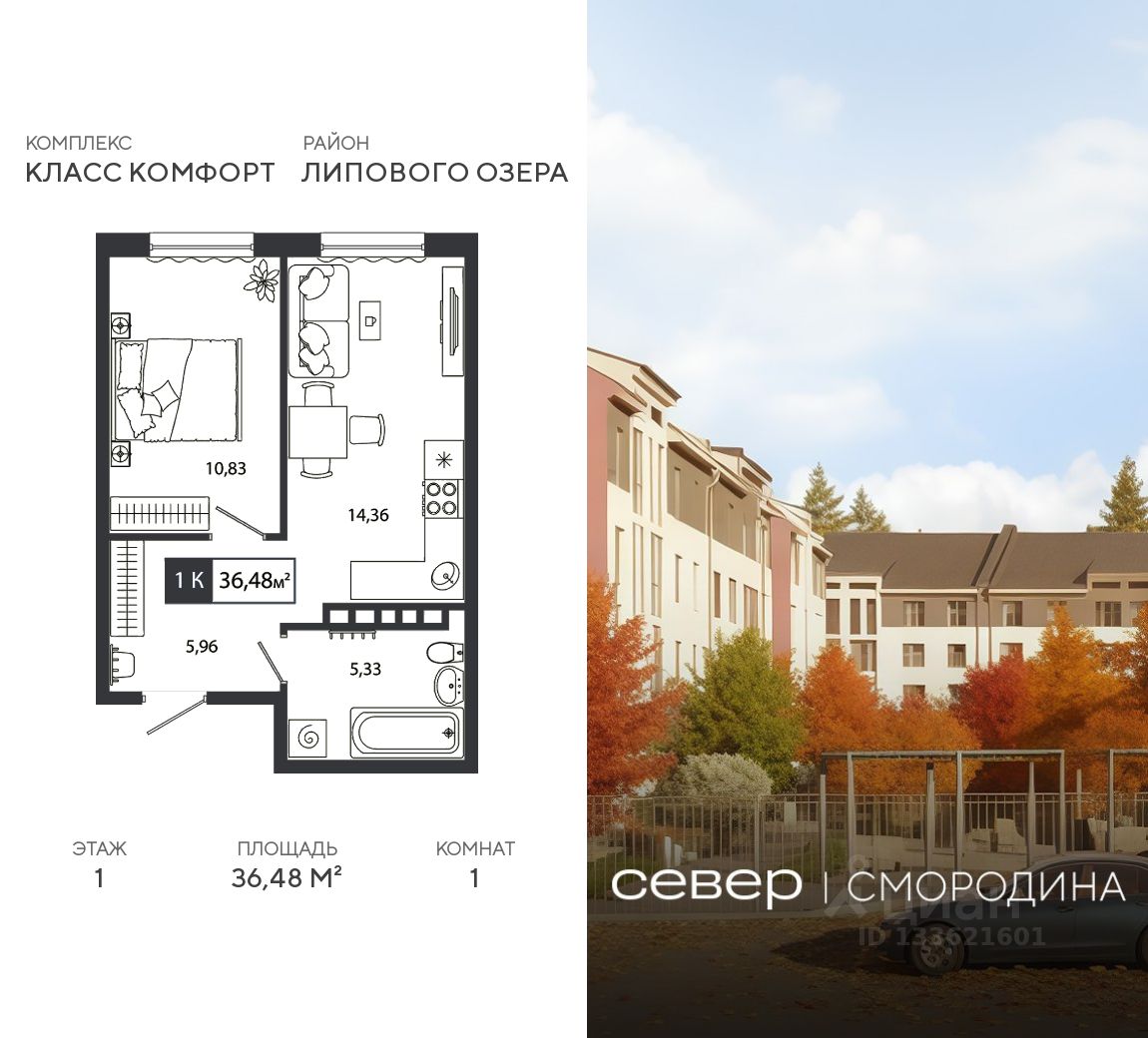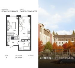 Продаётся квартира площадью 36.48 м2 в жилом комплексе "Смородина". Квартира находится на 1 этаже, жилая площадь квартиры 10.83 м2, площадь просторной кухни — 14.36 м2. Среди особенностей планировки — изолированные комнаты с окнами на одну сторону, 1 совмещённый санузел.