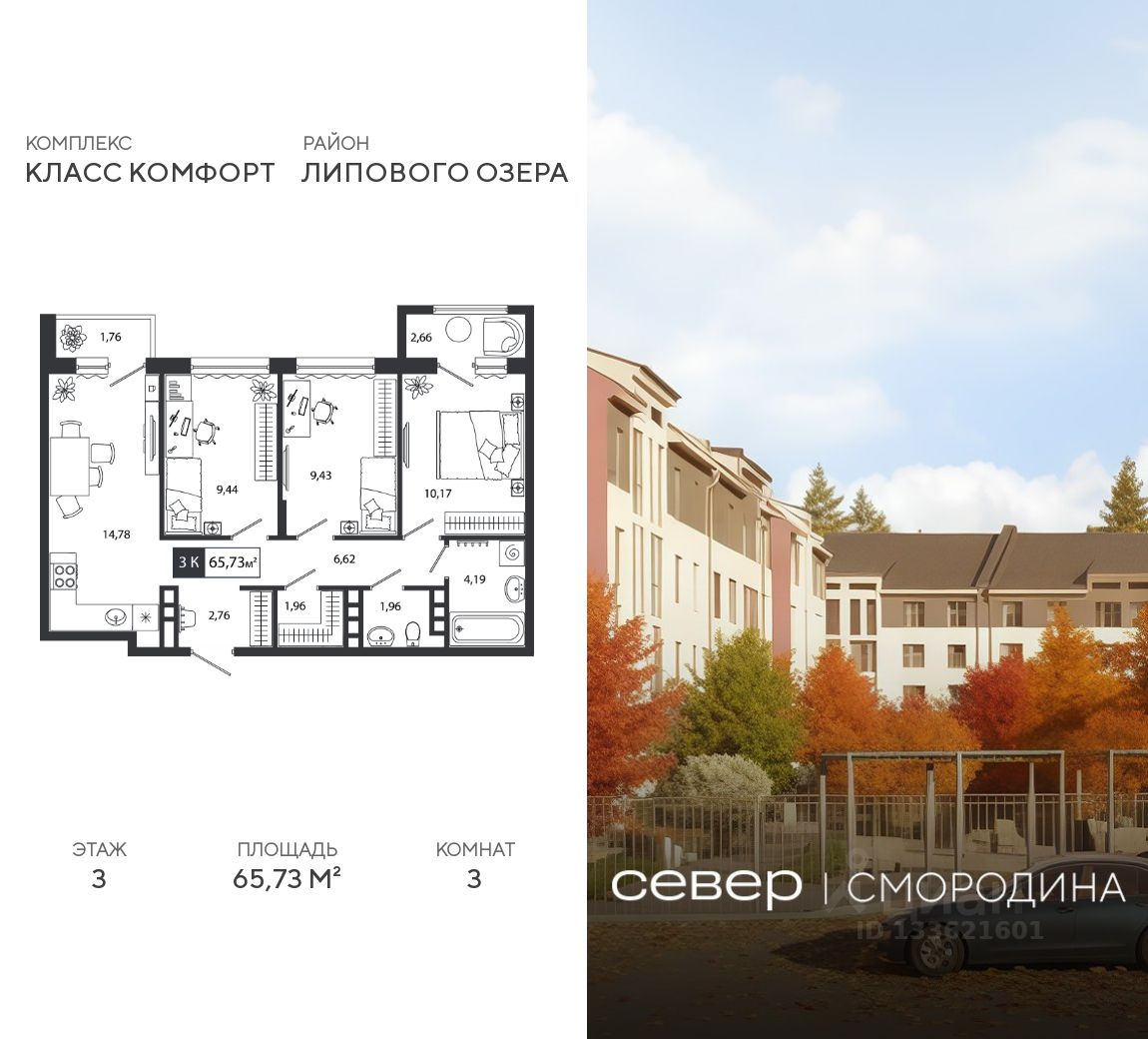 Продаётся квартира площадью 65.73 м2 в жилом комплексе "Смородина". Квартира находится на 3 этаже, жилая площадь квартиры 29.04 м2, площадь просторной кухни — 14.78 м2. Среди особенностей планировки — изолированные комнаты с окнами на одну сторону, 1 совмещённый санузел.