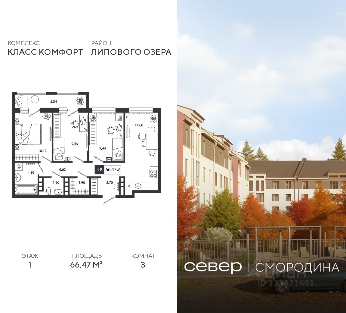 Продаётся квартира площадью 66.47 м2 в жилом комплексе "Смородина". Квартира находится на 1 этаже, жилая площадь квартиры 29.04 м2, площадь просторной кухни — 14.60 м2. Среди особенностей планировки — изолированные комнаты с окнами на одну сторону, 1 совмещённый санузел.