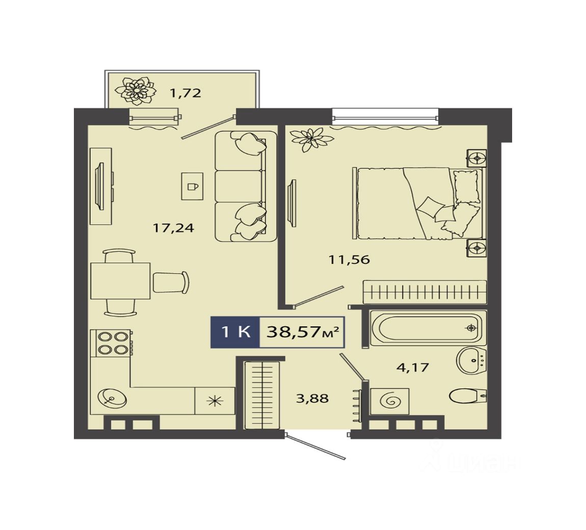 Общая площадь38,57 м²
