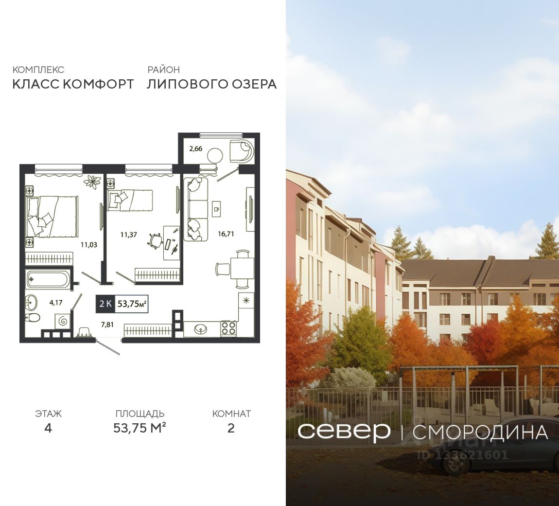 Продаётся квартира площадью 53.75 м2 в жилом комплексе "Смородина". Квартира находится на 4 этаже, жилая площадь квартиры 22.40 м2, площадь просторной кухни — 16.71 м2. Среди особенностей планировки — изолированные комнаты с окнами на одну сторону, 1 совмещённый санузел.