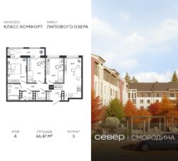 Продаётся квартира площадью 66.47 м2 в жилом комплексе "Смородина". Квартира находится на 4 этаже, жилая площадь квартиры 29.04 м2, площадь просторной кухни — 14.60 м2. Среди особенностей планировки — изолированные комнаты с окнами на одну сторону, 1 совмещённый санузел.