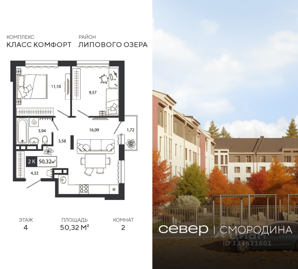 Продаётся квартира площадью 50.32 м2 в жилом комплексе "Смородина". Квартира находится на 4 этаже, жилая площадь квартиры 20.67 м2, площадь просторной кухни — 16.09 м2. Среди особенностей планировки — изолированные комнаты с окнами на одну сторону, 1 совмещённый санузел.
