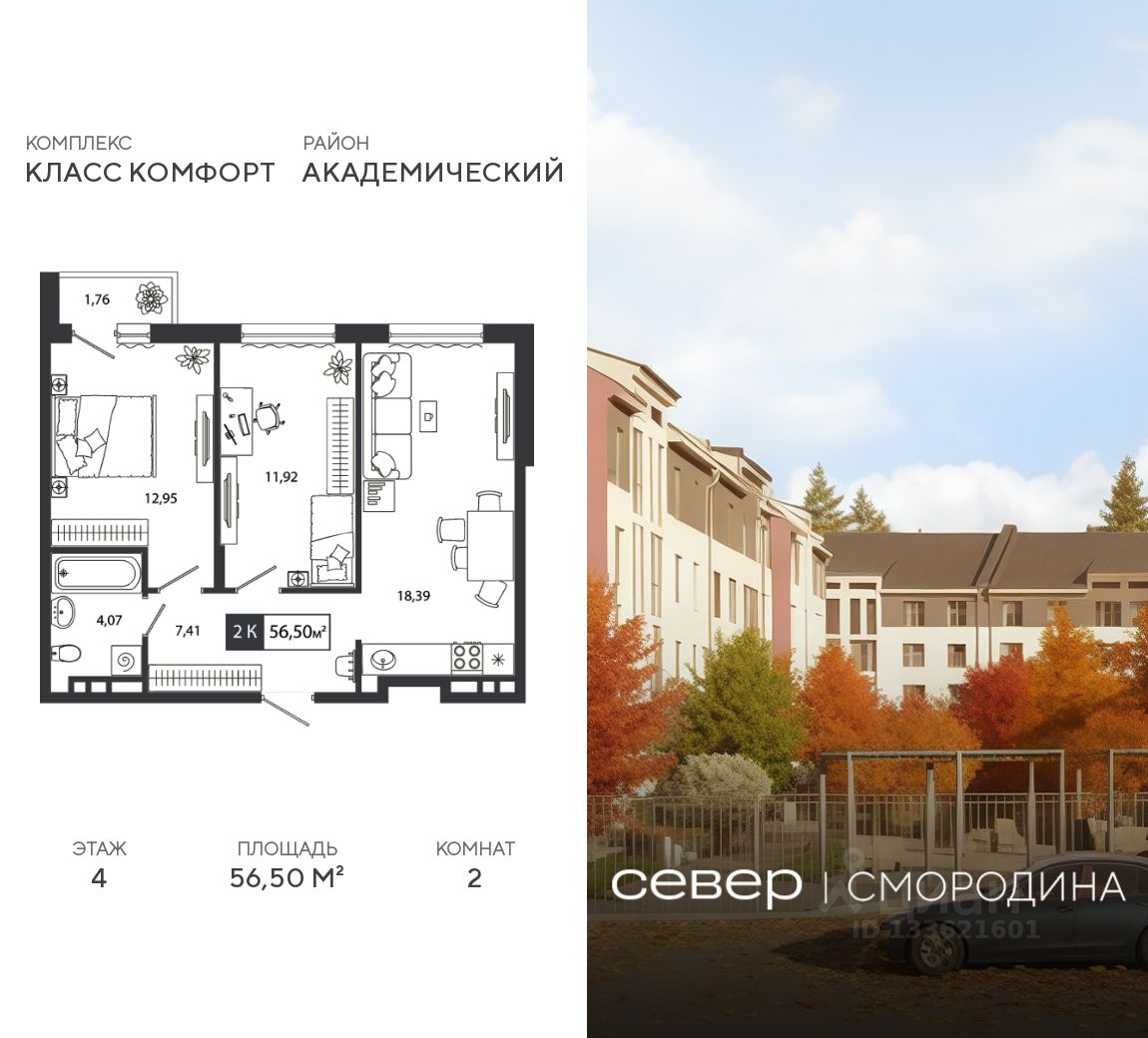 Продаётся квартира площадью 56.50 м2 в жилом комплексе "Смородина".