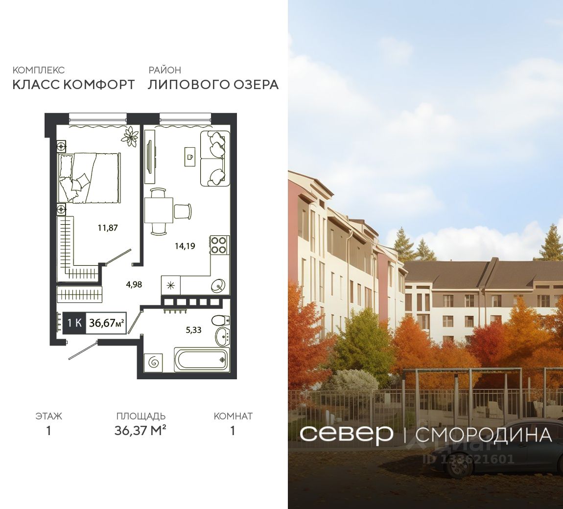 Продаётся квартира площадью 36.37 м2 в жилом комплексе "Смородина". Квартира находится на 1 этаже, жилая площадь квартиры 11.87 м2, площадь просторной кухни — 14.19 м2. Среди особенностей планировки — изолированные комнаты с окнами на одну сторону, 1 совмещённый санузел. Срок сдачи — IV кв. 2026 Жилой комплекс "Смородина" — это: - уютный малоэтажный комплекс в районе ММС - дома высотой 4 этажа - квартиры от студий до семейных вариантов с отапливаемыми лоджиями - экологичные материалы в благоустройстве территории Окружение В 5 минутах ходьбы от проекта — озеро Липовое с песчаным пляжем и лесопарковая зона. Инфраструктура В шаговой доступности есть все для комфортной жизни: школы, детские сады, магазины и аптеки. Рядом с проектом — остановка общественного транспорта. Благоустройство Прямо во дворе — собственные грядки для жителей, где можно выращивать зелень и цветы. Для детей оборудованы детские площадки из натуральных материалов. Лобби Вдохновленные современными тенденциями наши парадные разработаны с акцентом на эстетическую привлекательность и практичность. Использование натуральных материалов и ярких цветовых акцентов создает атмосферу уюта и стиля. Планировки Среди многообразия продуманных планировок есть и уютные студии, и просторные семейные варианты. Во всех квартирах предусмотрены отапливаемые лоджии, где можно устроить зону отдыха или рабочий кабинет.