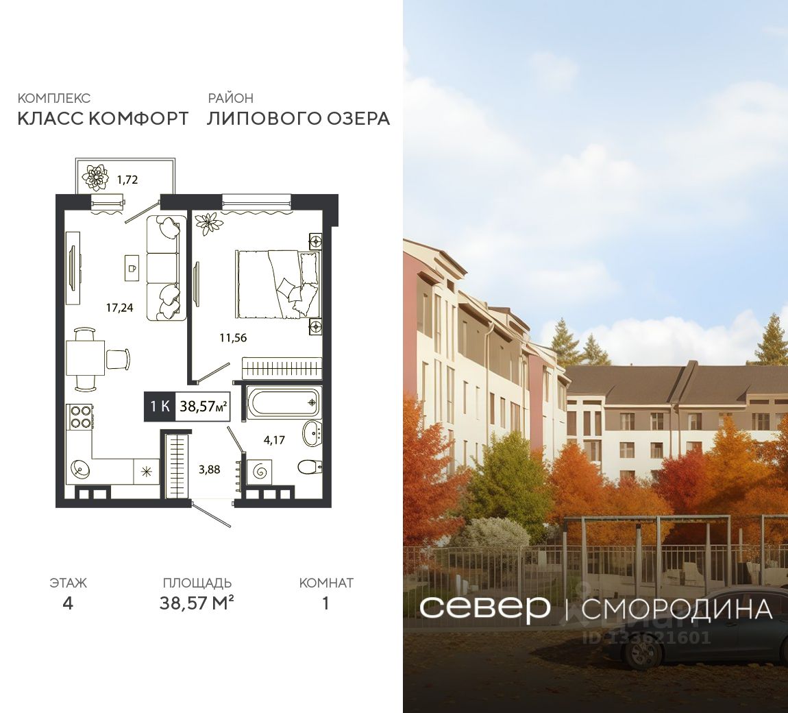 Продаётся квартира площадью 38.57 м2 в жилом комплексе "Смородина". Квартира находится на 4 этаже, жилая площадь квартиры 11.56 м2, площадь просторной кухни — 17.24 м2. Среди особенностей планировки — изолированные комнаты с окнами на одну сторону, 1 совмещённый санузел.