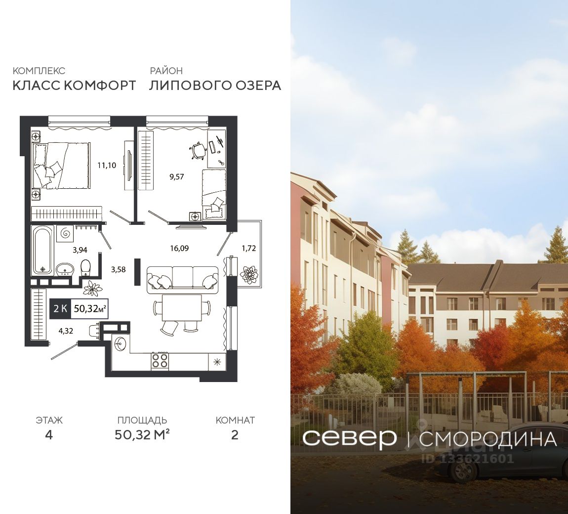 Продаётся квартира площадью 50.32 м2 в жилом комплексе "Смородина". Квартира находится на 4 этаже, жилая площадь квартиры 20.67 м2, площадь просторной кухни — 16.09 м2. Среди особенностей планировки — изолированные комнаты с окнами на одну сторону, 1 совмещённый санузел.