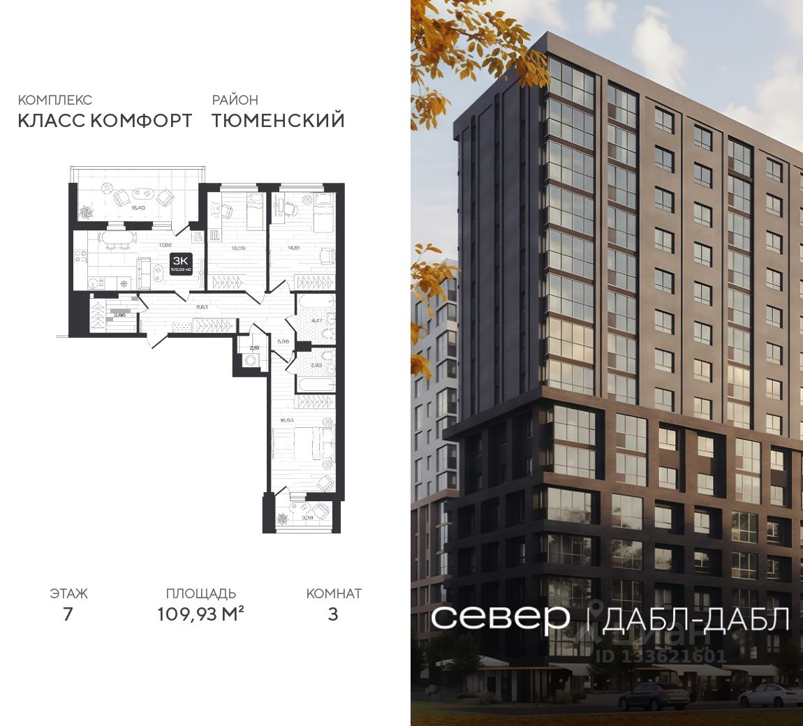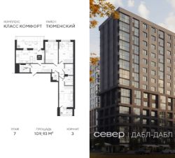 Продаётся квартира площадью 109.93 м2 в жилом комплексе "Дабл-Дабл". Квартира находится на 7 этаже, жилая площадь квартиры 44.43 м2, площадь просторной кухни — 17.86 м2. Среди особенностей планировки — изолированные комнаты с окнами на одну сторону, 1 совмещённый санузел.