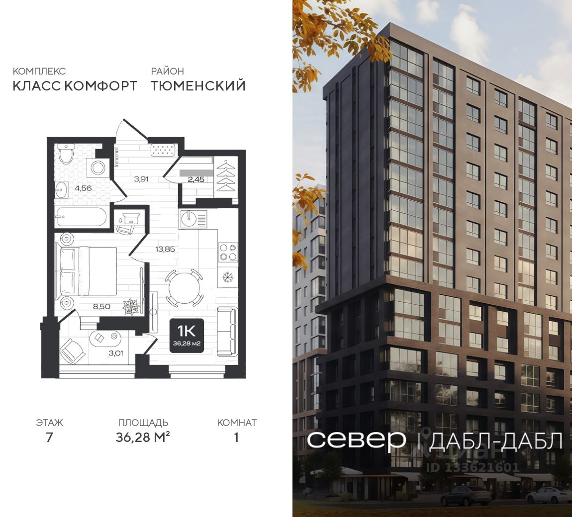 Продаётся квартира площадью 36.28 м2 в жилом комплексе "Дабл-Дабл". Квартира находится на 7 этаже, жилая площадь квартиры 8.50 м2, площадь просторной кухни — 13.85 м2. Среди особенностей планировки — изолированные комнаты с окнами на одну сторону, 1 совмещённый санузел.