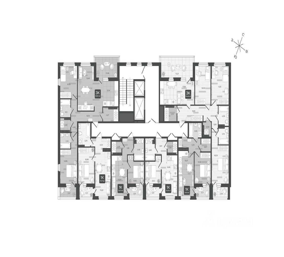 - квартиры от 1-комнатных до 2-уровневых
