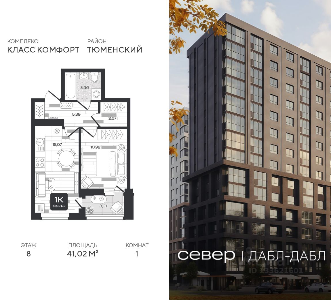 Продаётся квартира площадью 41.02 м2 в жилом комплексе "Дабл-Дабл". Квартира находится на 8 этаже, жилая площадь квартиры 10.92 м2, площадь просторной кухни — 15.07 м2. Среди особенностей планировки — изолированные комнаты с окнами на одну сторону, 1 совмещённый санузел.