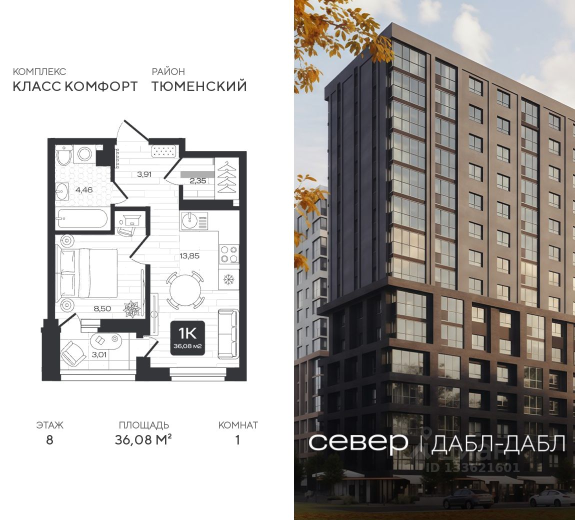 Продаётся квартира площадью 36.08 м2 в жилом комплексе "Дабл-Дабл". Квартира находится на 8 этаже, жилая площадь квартиры 8.50 м2, площадь просторной кухни — 13.85 м2. Среди особенностей планировки — изолированные комнаты с окнами на одну сторону, 1 совмещённый санузел.